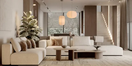 A warm, inviting mix of natural textures and soft fabrics, layered neutrals, and botanical touches. This living space balances grounded comfort with elegance, perfect for quiet moments or lively gatherings.